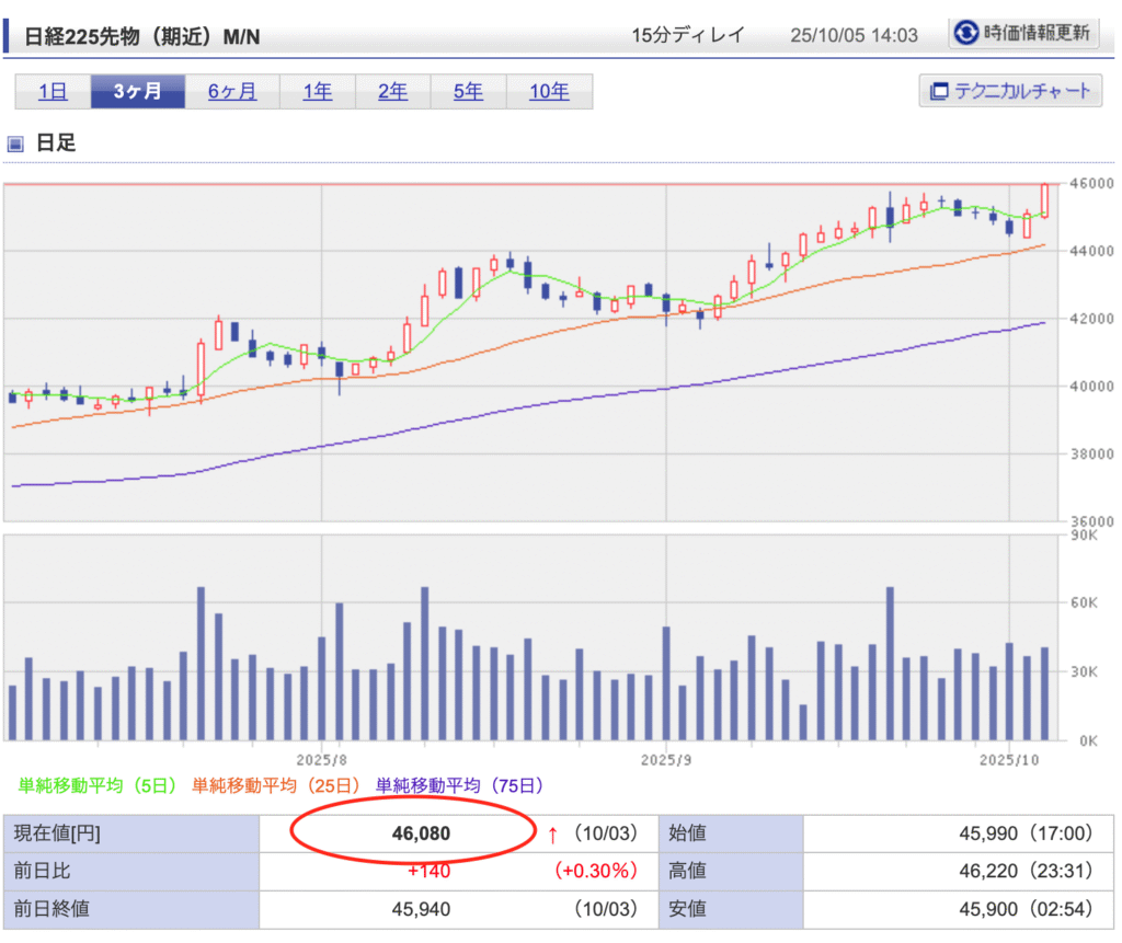 10月3日金曜の日経平均先物の終値が、初めて46,000円台で取引を終了しています。