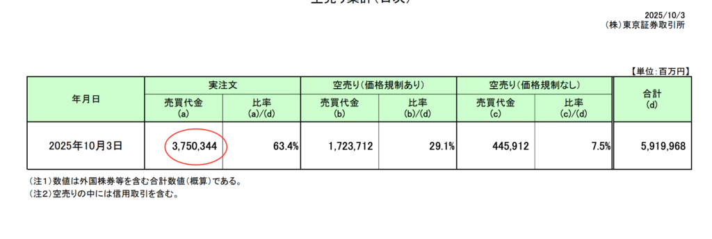 赤丸で囲んだ部分は、10月3日に空売り注文が3兆7,000億円もあり、全体の取引のうち63.4%を占めていることが読み解けます。