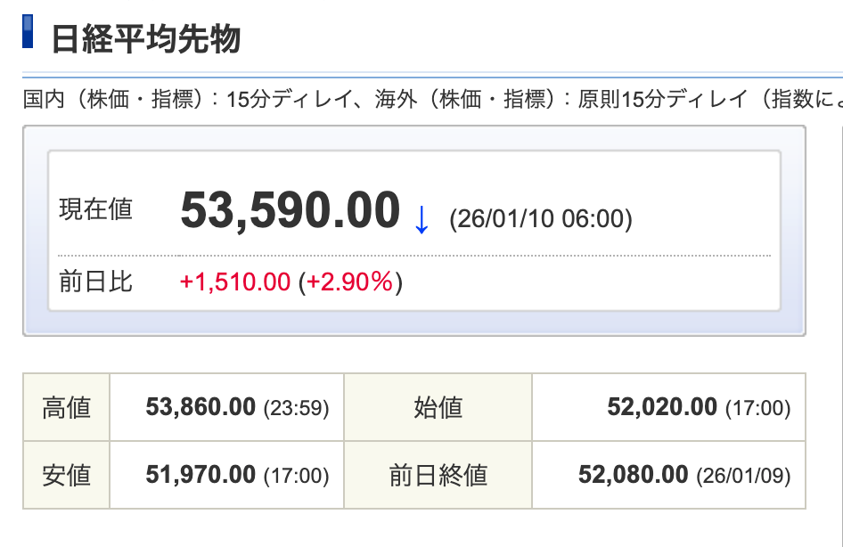 日経平均株価の先物が史上最高値付近まで上昇してめちゃくちゃ上がっています。